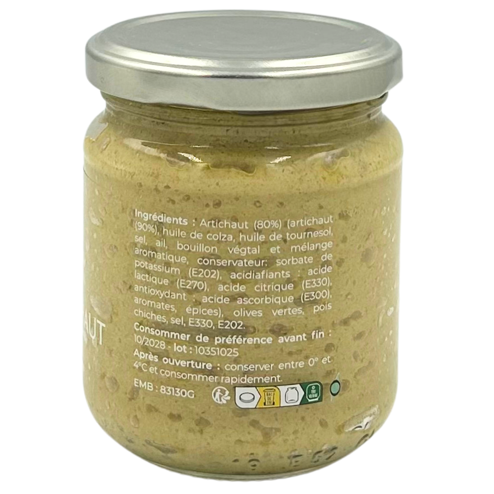 | Ingrédients | Artichaut (80%) (artichaut (90%), huile de colza, huile de tournesol, sel, ail, bouillon végétal, mélange aromatique), conservateur : sorbate de potassium (E202), acidifiant : acide lactique (E270), antioxydant : acide ascorbique (E300), aromates, épices)), olives vertes, pois chiches, sel, E330, E202. | |